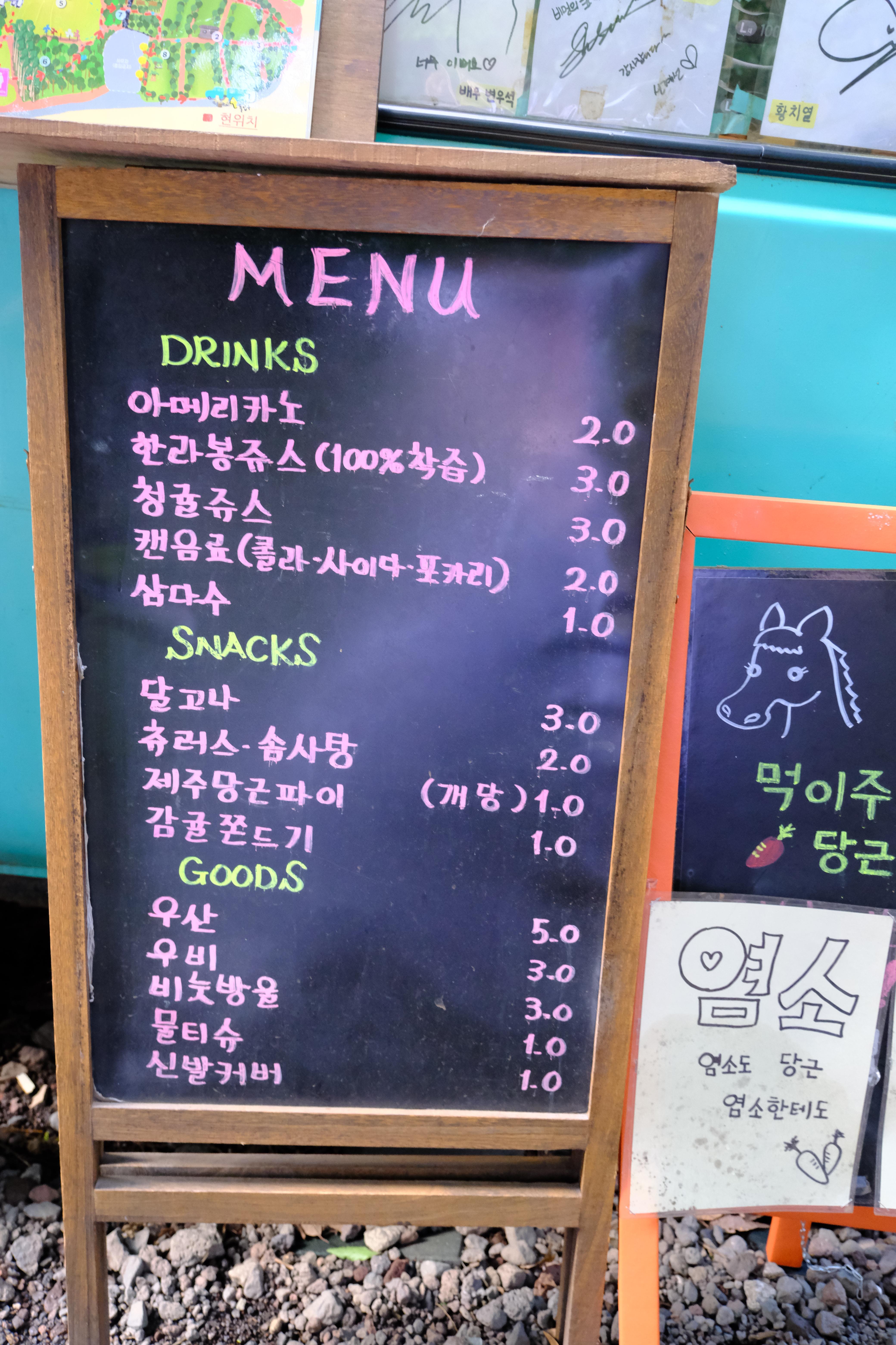 입구에서 표를 끊고 음료 및 말과 염소 먹이 주기 체험 당근 구매가 가능합니다.